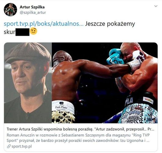 Szpilka nie zamierza jednak się decydować na taki krok. Już 26 października zmierzy się w Sosnowcu z Fabio Tuiachem. Polak chce odbudować swoją karierę. W internecie odgraża się swoim hejterom. "Jeszcze pokażemy sk****" - napisał na Twitterze, komentując wywiad trenera Romana Anuczina z TVP Sport.