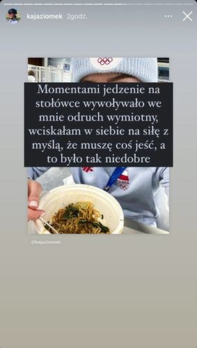 Reprezentantka Polski odniosła się do tego tematu także za pośrednictwem insta story. "Momentami jedzenie na stołówce wywoływało we mnie odruch wymiotny, wciskałam w siebie na siłę z myślą, że muszę coś jeść, a to było tak niedobre" - czytamy.