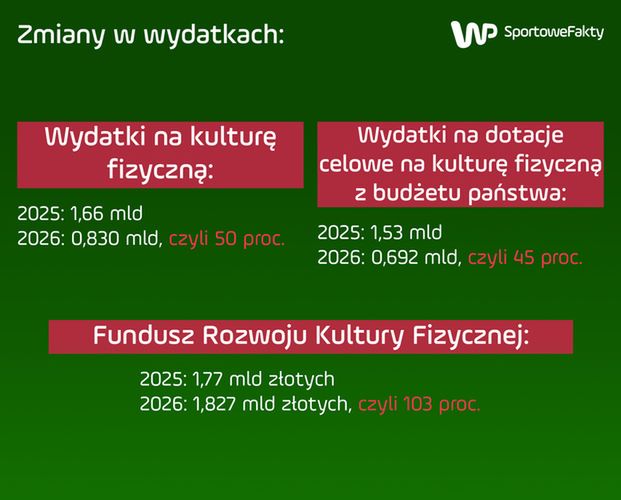 Zapisy w projekcie ustawy budżetowej nie są optymistyczne. Z obecnych 1,66 mld złotych na kulturę fizyczną, w przyszłym roku pozostać ma zaledwie... 830 mln złotych. Duża część tej kwoty to efekt zakończenia programu budowy około 700 hal sportowych "Olimpia", na który w 2025 roku przeznaczono prawie 658 mln złotych. Poza tymi pieniędzmi z projektu budżetu "zniknęło" 172 mln złotych.