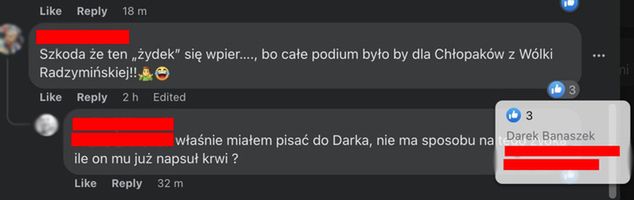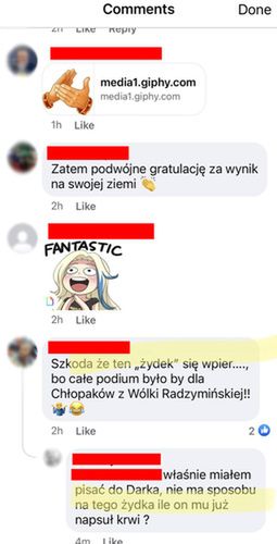 "Szkoda, że ten żydek się wpier..., bo całe podium byłoby dla Chłopaków z Wólki Radzymińskiej" - tak brzmiał jeden z nich.
