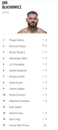 Największy awans w rankingu kategorii półciężkiej zanotował Magomied Ankalajew (o dwa miejsca). Do pierwszej "15" wskoczył Ovince St. Preux.