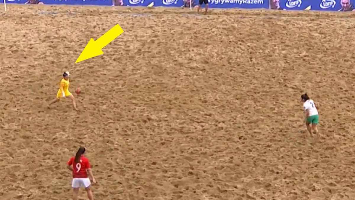 Bramkarka wybiła piłkę spod własnego pola karnego. Siła uderzenia była tak duża, że futbolówka wpadła idealnie pod poprzeczkę bramki drużyny przeciwnej.