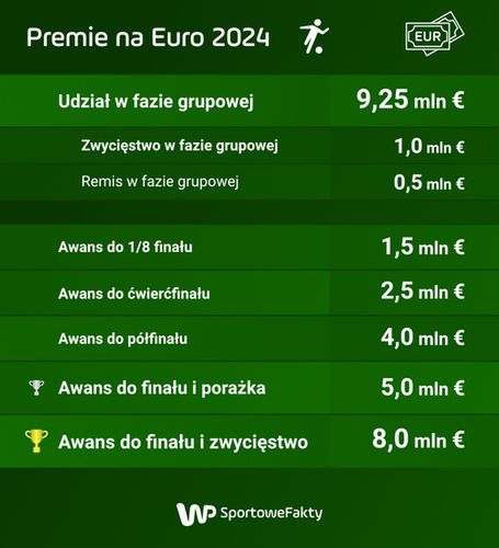 Awans do półfinału zostanie wynagrodzony 4 mln w unijnej walucie, zaś kwalifikacja do finału to co najmniej 5 mln w przypadku porażki. Drużyna, która sięgnie po główne trofeum, dostanie za ostateczną rozgrywkę aż 8 mln euro.
