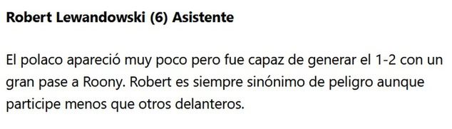 Dziennik "Mundo Deportivo" tradycyjnie nie wystawił piłkarzom za ten występ żadnych not, a jedynie scharakteryzował ich grę. Lewandowski został nazwany "hojnym".