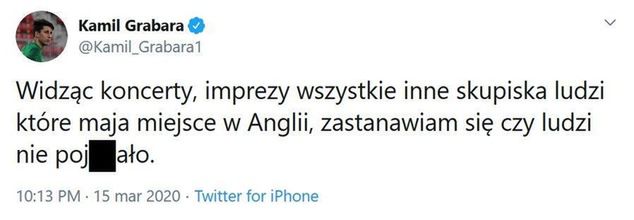 Taką sytuację w ostrych słowach skomentował Kamil Grabara, który jest bramkarzem występującego w The Championship Huddersfield Town. "Widząc koncerty, imprezy, wszystkie inne skupiska ludzi, które mają miejsce w Anglii, zastanawiam się, czy ludzi nie poj**ało" - napisał na Twitterze Grabara, który znany jest z tego, że nie gryzie się w język.
