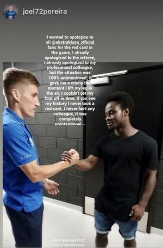 "Chciałbym przeprosić wszystkich kibiców Ekstraklasy za czerwoną kartkę w meczu. Przeprosiłem już także sędziego, przeprosiłem także rywala, ale zapewniam, że sytuacja była w 100 procentach niezamierzona. Złapał mnie skurcz w momencie, gdy podniosłem nogę w powietrzu i nie byłem w stanie odsunąć nogi na czas. Jeśli spojrzycie na moją historię, nigdy nie dostałem czerwonej kartki, nigdy nie zrobiłem krzywdy rywalowi" - napisał Pereira.