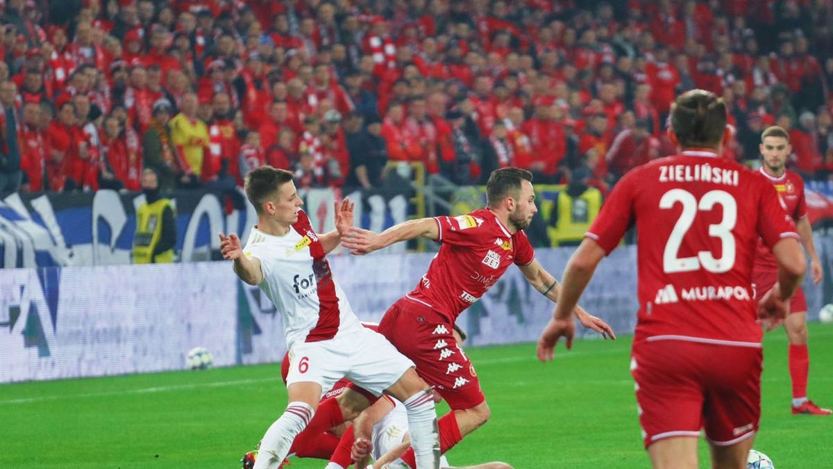 Z pierwszych piętnastu minut spotkania gry było co najwyżej kilka, bo Szymon Marciniak musiał przerwać grę ze względu na zadymienie przestrzeni boiska. A gdy upłynął pierwszy kwadrans, goście objęli prowadzenie. Wydawało się, że piłka zagrana do Pirulo na prawe skrzydło była za mocna, ale Hiszpan uratował ją tuż przed linią boczną, a następnie zszedł do środka tuż przy polu karnym i uderzył w światło bramki, a Jakub Wrąbel, który dotąd był jednym z najsilniejszych ogniw czerwono-biało-czerwonych, skiksował. Po chwili mogło i powinno być 0:2, bo Radaszkiewicz uciekł na czystą pozycję i podał wzdłuż bramki, ale... do nikogo.