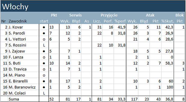 Trener reprezentacja Włoch w meczu z USA dał szansę zagrać wszystkim swoim zawodnikom. Najlepiej z nich spisał się Jiri Kovar, który zgromadził 13 punktów. Z dobrej strony pokazał się również Simone Buti. Włoch atakował ze skutecznością ponad 58 proc.