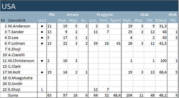 Najwięcej punktów dla reprezentacji USA zdobył Maxwell Holt, który na swoim koncie zapisał 19 "oczek". Amerykanin atakował ze skutecznością na poziomie ponad 68 proc. Dobrym przyjęciem popisywał się za to Paul Lotman.