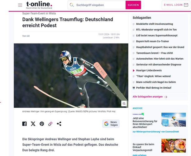 "Andreas Wellinger wymarzonym lotem zapewnił niemieckim skoczkom miejsce na podium na początku nowego turnieju polSKIego" - czytamy w serwisie t-online.de.