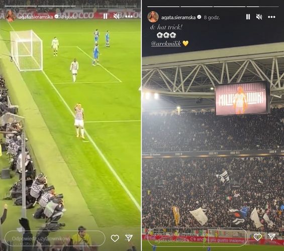 Najpierw serduszko złożone z dłoni, potem wysłany buziak - tak Milik podziękował ukochanej za wsparcie. Sieramska wszystko to uwieczniła w mediach społecznościowych (na Instastories). Drugie nagranie wrzuciła, gdy skompletował hat-tricka.
