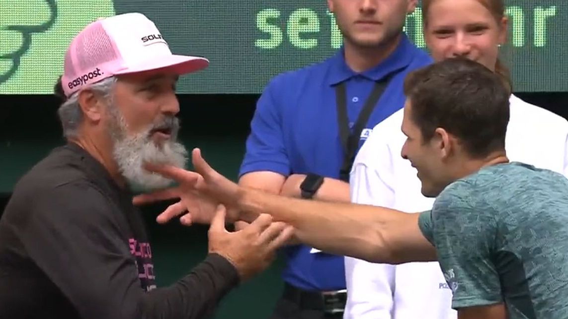 Wymowny gest 25-latka, który dotknął szkoleniowca za... brodę, wszystko wyjaśnia. "Dam mu brzytwę" - komentuje twitterowy profil Tennis TV, gdzie zamieszczono krótkie nagranie z radości w obozie "Hubiego" (patrz poniżej).