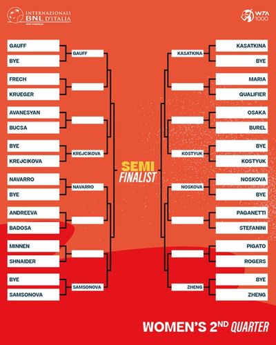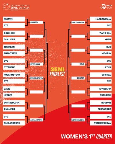 W ćwiartce Świątek znalazła się także oznaczona szóstym numerem Czeszka Marketa Vondrousova. Polka z reprezentantką naszych południowych sąsiadów może się spotkać w ćwierćfinale. Na tym samym etapie na drodze pierwszej rakiety świata może także stanąć Brazylijka Beatriz Haddad Maia, Rumunka Sorana Cirstea czy Amerykanka Madison Keys, którą nasza tenisistka pokonała w Madrycie w półfinale.