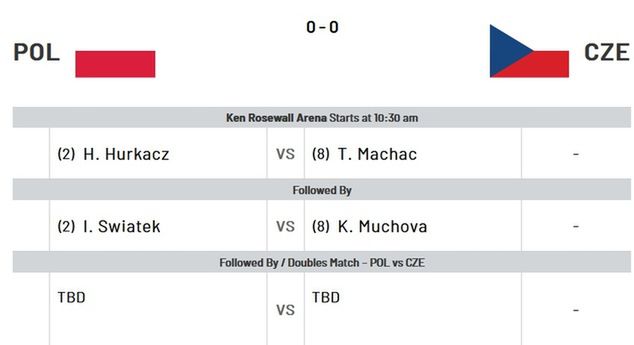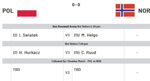 Spotkanie to rozpocznie się od pojedynku Hurkacz - Machac. Następnie dojdzie do interesującego starcia Świątek - Muchova. Czeszka odzyskała dawny blask po problemach zdrowotnych, dlatego jej pojedynek z aktualną wiceliderką zapowiada się bardzo ciekawie. Na koniec odbędzie się jeszcze gra mieszana, która może mieć ogromne znaczenie dla losów spotkania i układu tabeli grupy B.