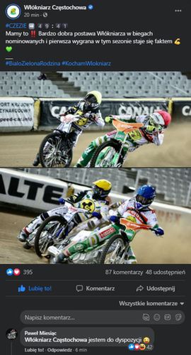 Zawodnik śledził sobotnie zmagania z Częstochowy i na Facebooku pod klubowym postem zamieścił wpis. "Jestem do dyspozycji" - napisał. Dodał przy tym emotikonę sugerującą dobry nastrój, ale biorąc pod uwagę wcześniejsze słowa o chęci jazdy w najwyższej klasie rozgrywkowej, wszystko wskazuje na to, że podjąłby rękawicę we Włókniarzu.