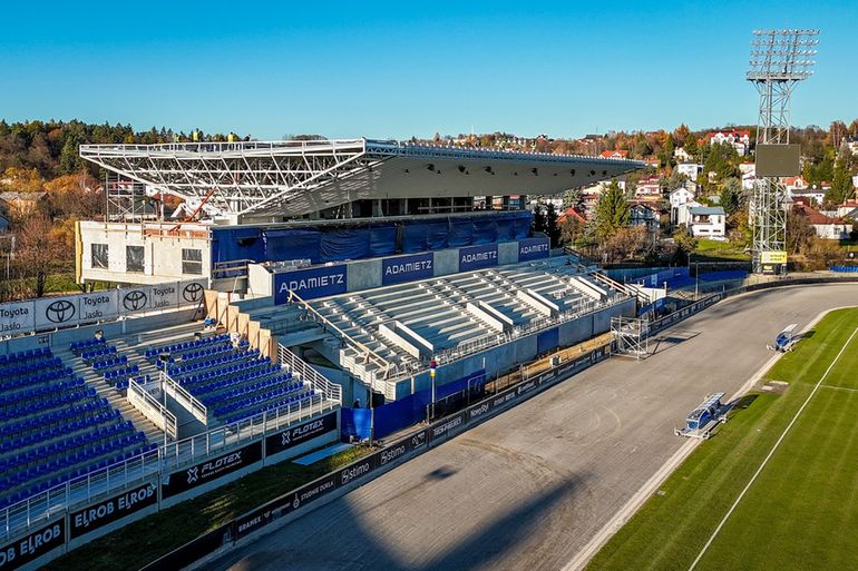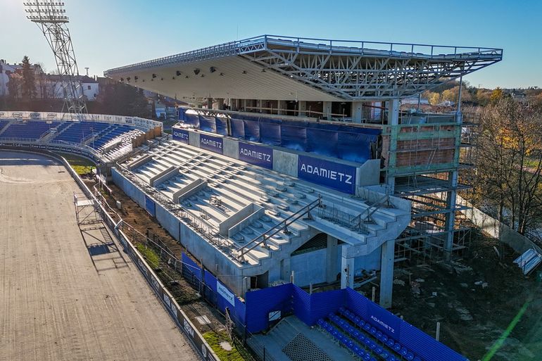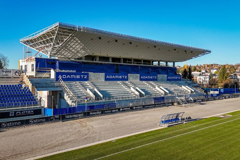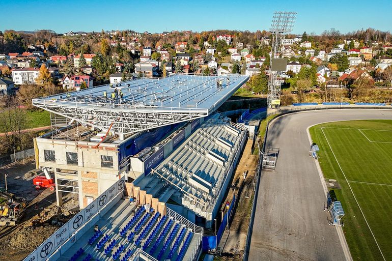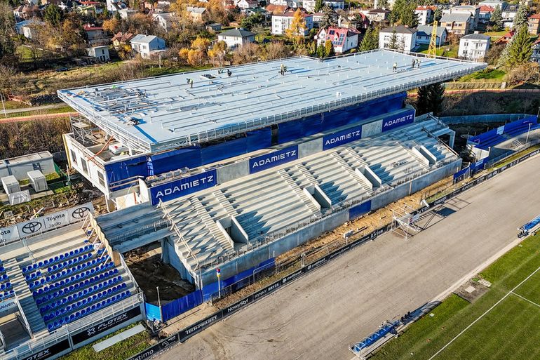 Budowa trybuny głównej stadionu przy ulicy Legionów 1 w Krośnie zmierza ku końcowi. Konstrukcja, która w ostatnich tygodniach nabrała kształtu, coraz mocniej dominuje nad obiektem i potwierdza, że inwestycja wchodzi w kluczową fazę.